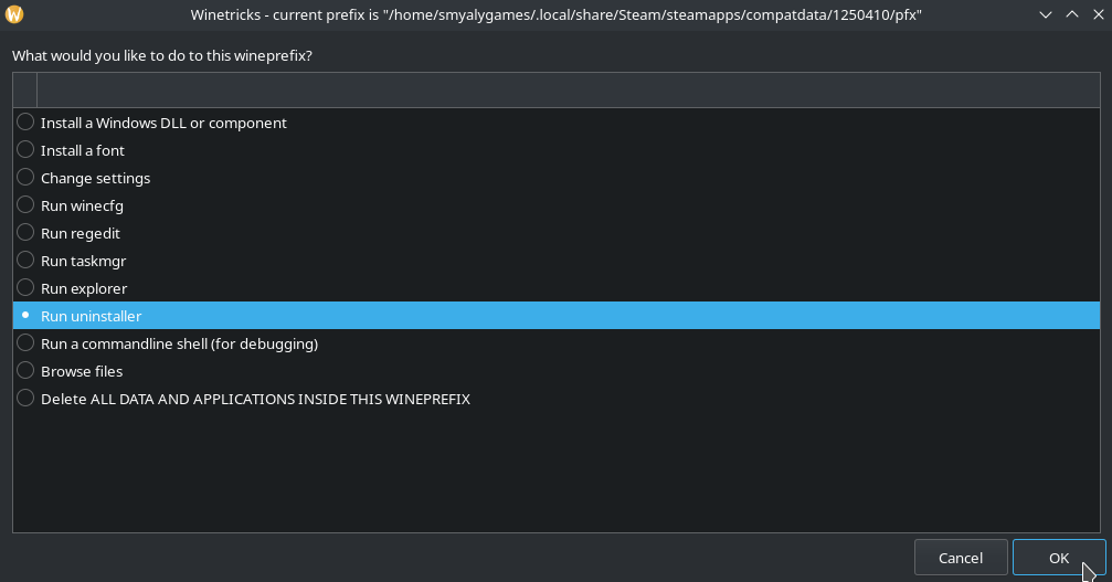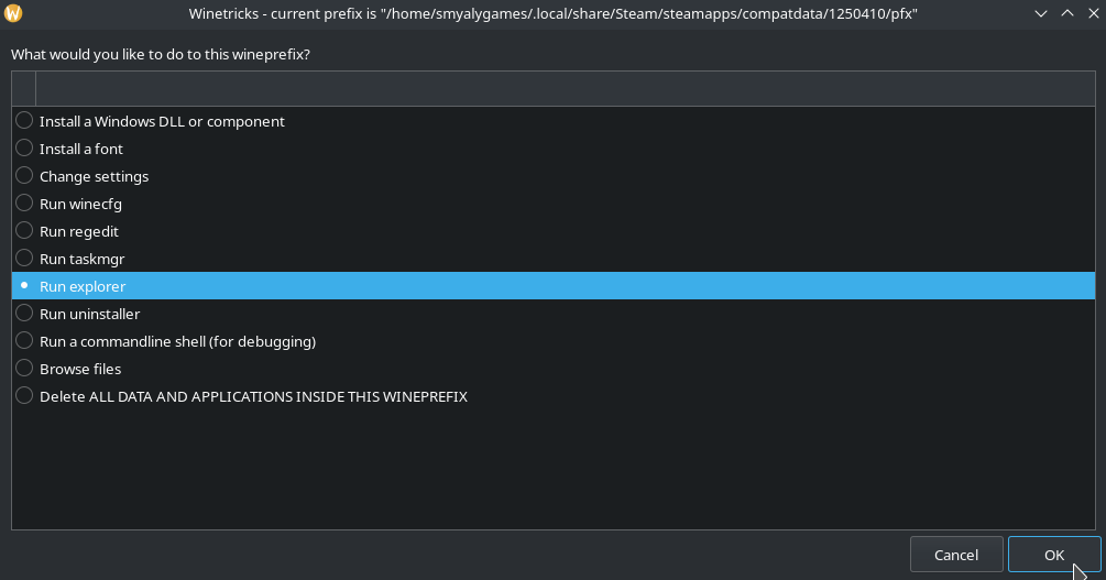 Once the Winetricks window pops up, OK on Select the default wineprefix