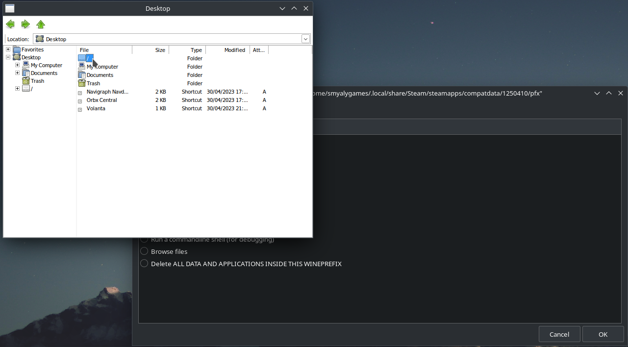 Which will pop up a window for Flight Simulator's Wine directory, where you'll need to navigate through Linux's